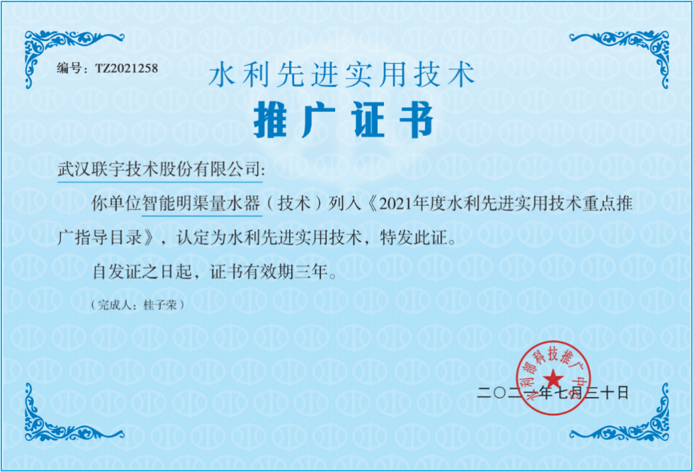 智能明渠量水器(技术)列入水利部“2021年水利先进实用技术重点推广指导目录” |